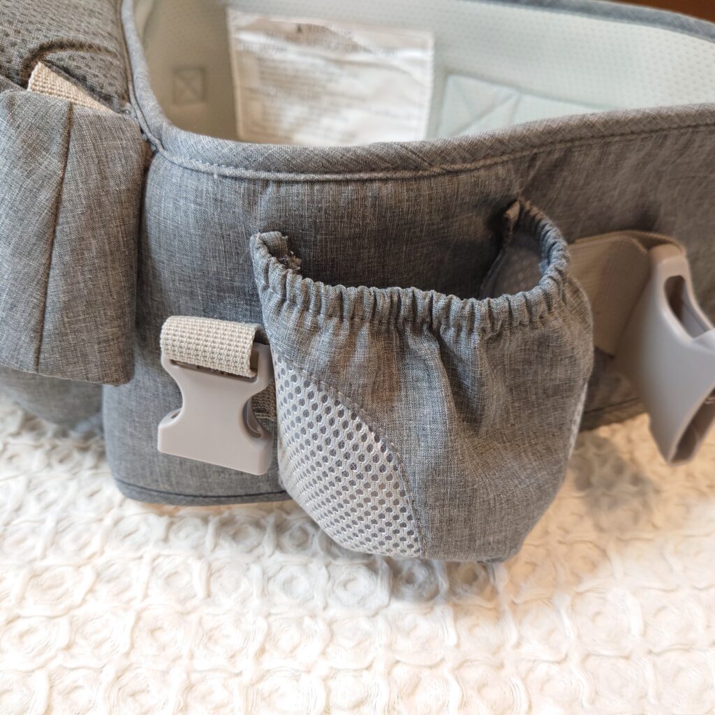 座面の部分だけでなく、装着した状態で右にも左にも小さなポケットがついているのでとても使いやすいです。ただ、装着した状態で右手側ポケットのファスナーを開けるのは結構至難の業だけど(あんまり使ってません)。。