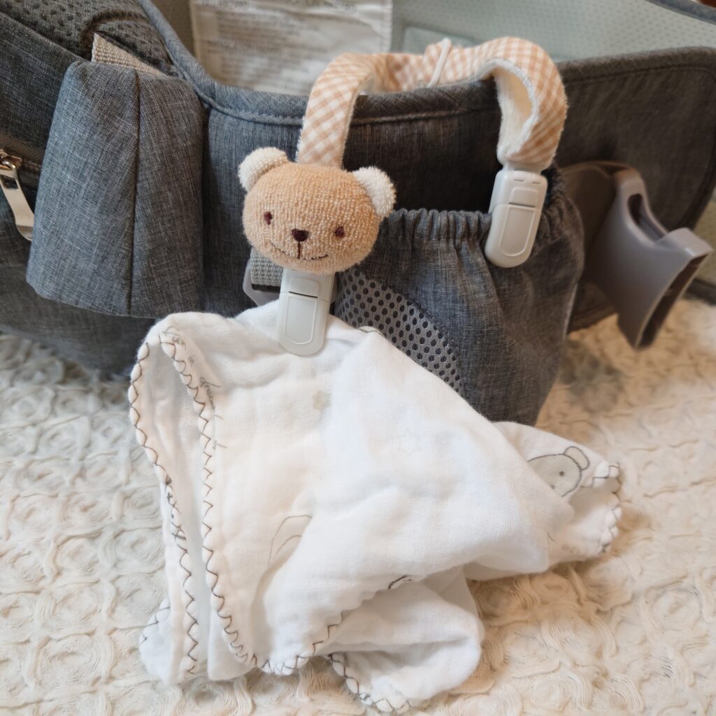 左手側のドリンクホルダー的なポケットには、いつもすぐに涎を受け止められるようにガーゼを忍ばせています。