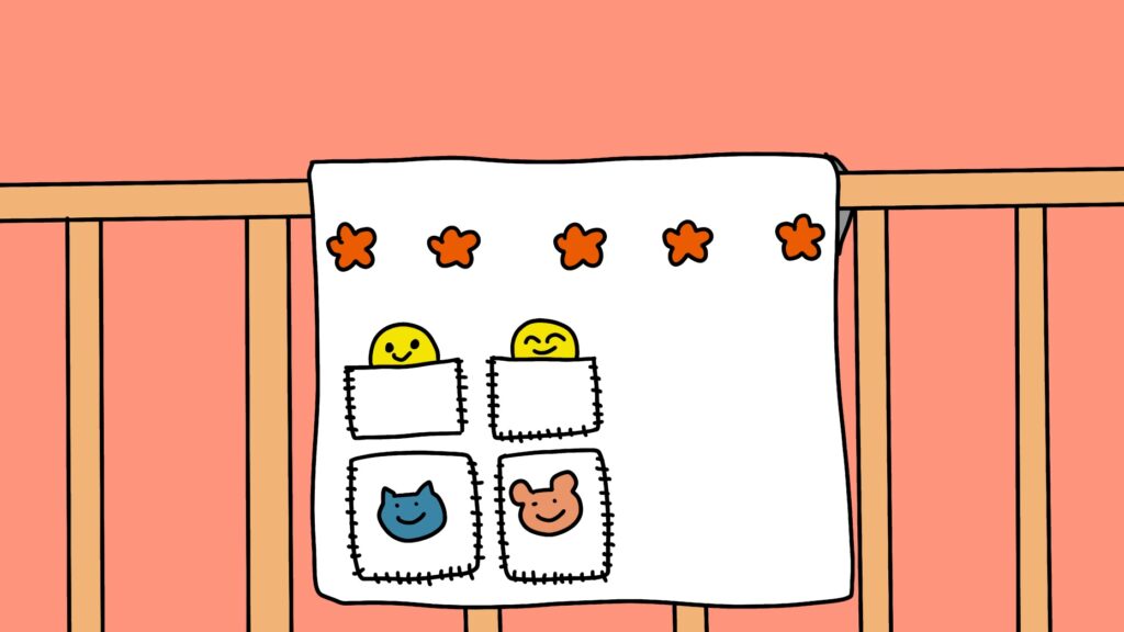 自分で取り出せるようになった時のために、フタ付きのポケットがあっても楽しいかも。ハイコントラストなポケットにしよう。