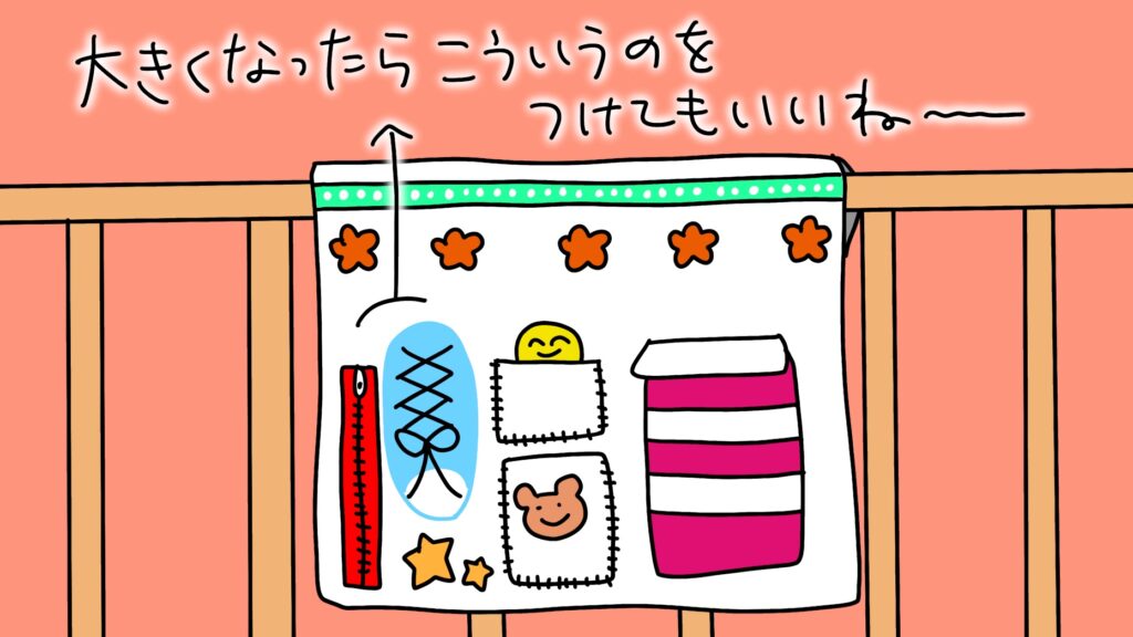自分でおもちゃが取り出せるくらいになったら、ジッパーつけたりリボン結びの練習台をつけたり、あとボタンの取り外しを練習できるようなところを作ったりしたら遊んでくれるかなぁ。いつごろからこういうの遊んでくれるようになるんだろう。