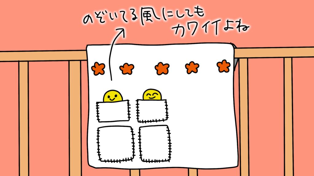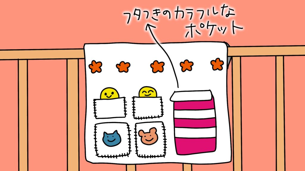 ダイソーで買ったしましまぐるぐるのカシャカシャとか、そういう細々したおもちゃが入れられるポケットがたくさん欲しい。