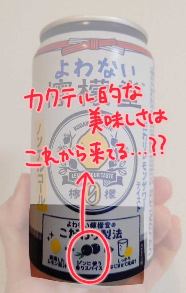カクテルっぽい味はどこから来てるんだろう。よわない檸檬堂のこだわり製法として、厳選したレモン果汁+ジンに使う香りスパイスを混ぜて完成!と言うことですが………