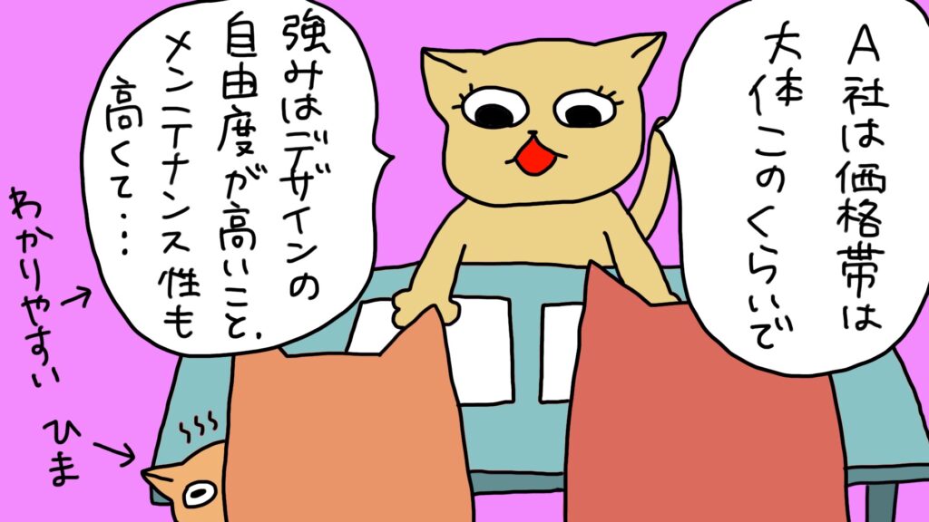 夫婦の意見をある程度まとめた後で、希望に沿う工務店やハウスメーカーを絞っていただき、会社ごとの特色と大まかな予算(15社くらいについて、価格帯をA〜Cに振り分けて説明していただけました)を教えていただけて、その中から4社、話を聞いてみることにしました。