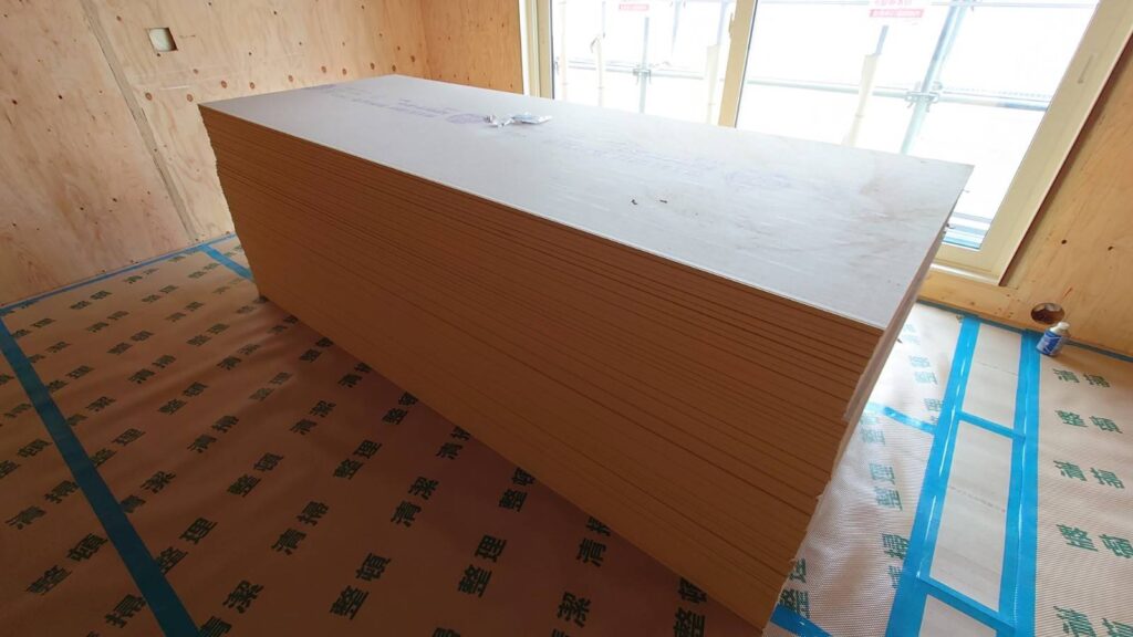 寝室には石膏ボードがどーん!と積まれていました。これ以外にも届くそうです。
