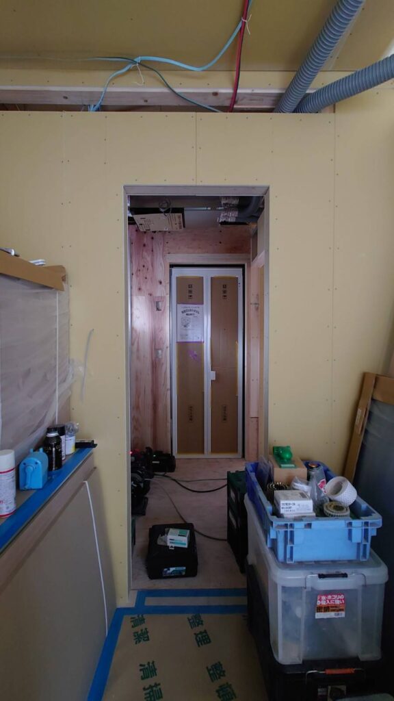 床にはもうフローリングが貼られていました~!汚れないように養生されていました。壁には石膏ボードが貼られ始めました。